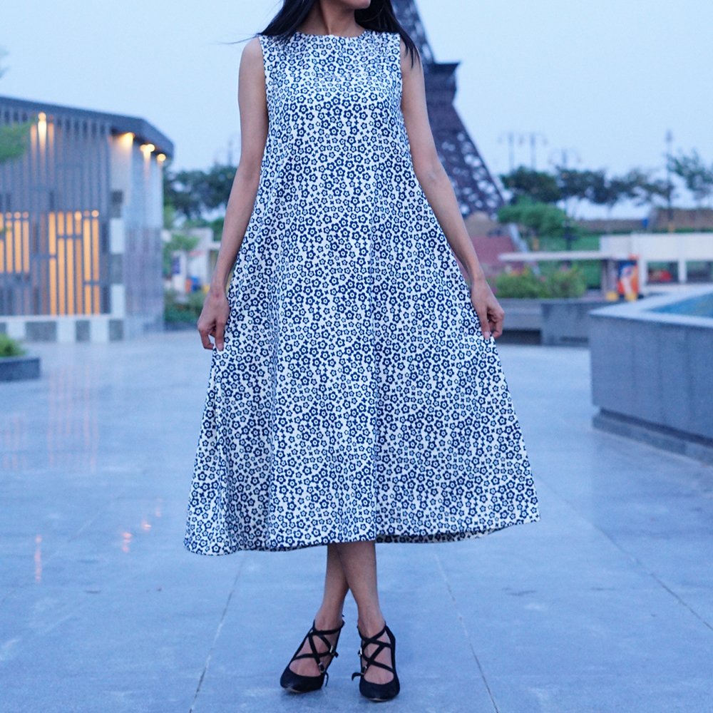 Effortless elegance meets modern comfort with our Floral Printed Sleeveless Midi Dress, designed to capture the essence of summer sophistication. Featuring a delicate navy floral pattern on a crisp white base, this A-line dress offers a flattering silhouette that moves gracefully with every step.