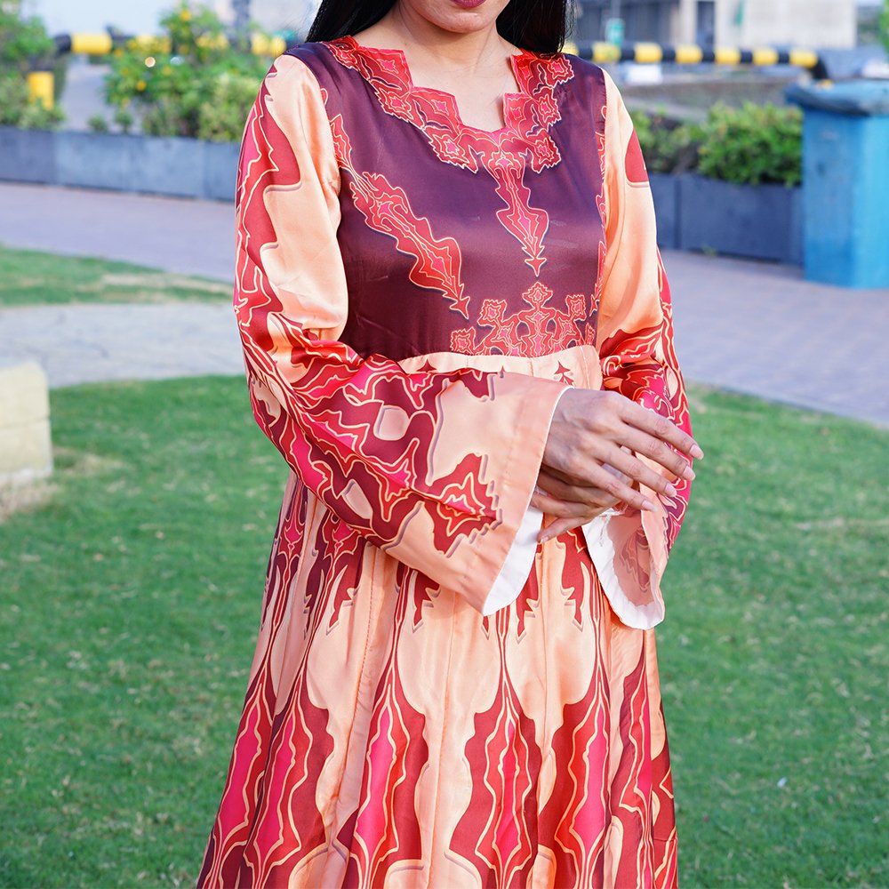 Ignite your wardrobe with this Fiery Grace Dress, a masterpiece crafted from luxurious satin fabric that glows with warmth and elegance. The vibrant red and orange abstract print creates a bold yet graceful look — perfect for women who love to stand out in style. The flared sleeves and flowy A-line silhouette give it a timeless charm, while the intricate neckline detailing adds a touch of sophistication. Whether it’s a festive occasion, dinner, or a classy evening event, this dress ensures all eyes are on you.