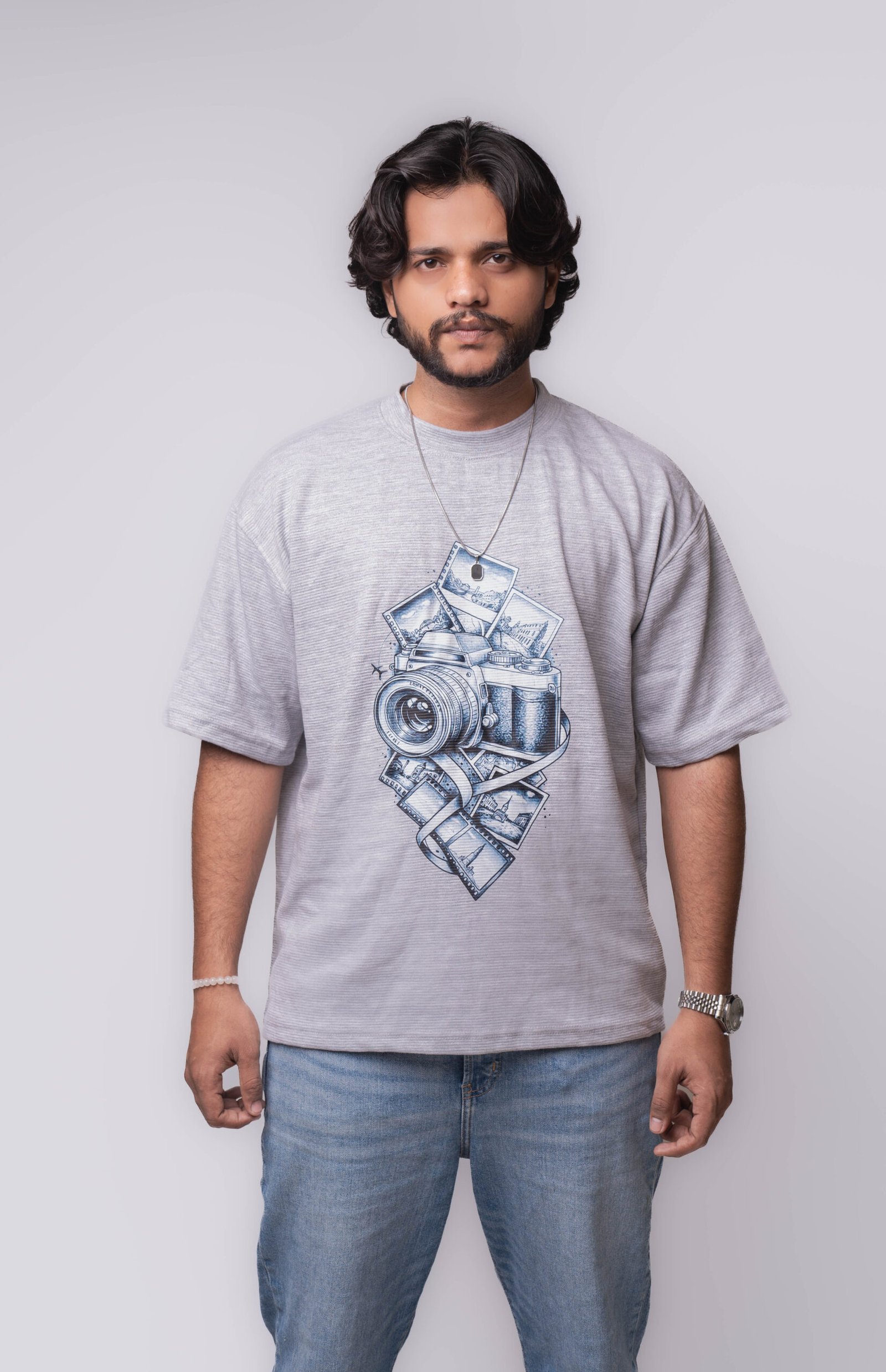 Express your creative side with this grey men’s graphic t-shirt featuring a camera print. Comfortable, stylish, and perfect for photography enthusiasts.