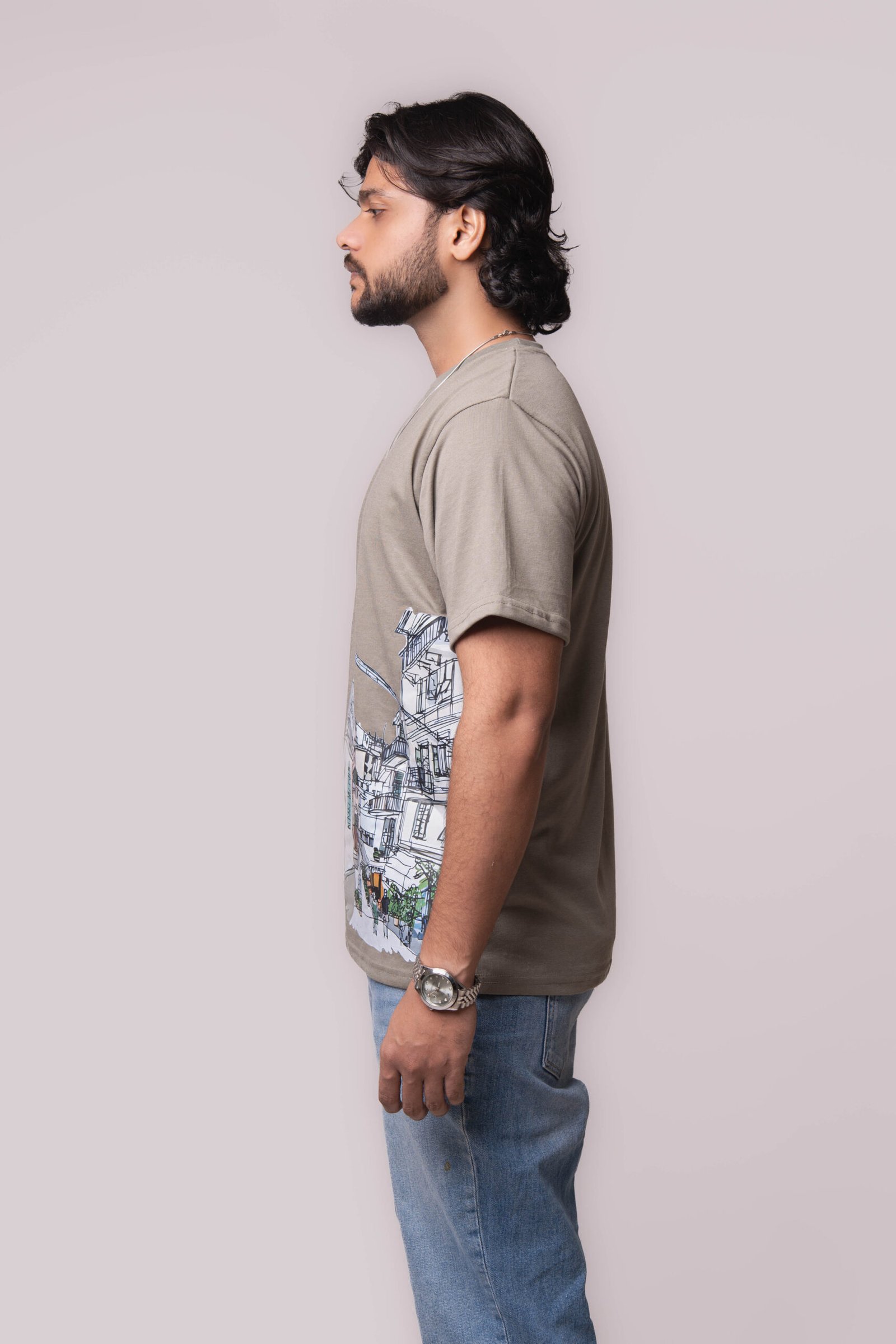 Shop this men’s olive green cityscape t-shirt – breathable cotton, relaxed fit, and stylish urban graphic print. Perfect casual wear in Pakistan.
