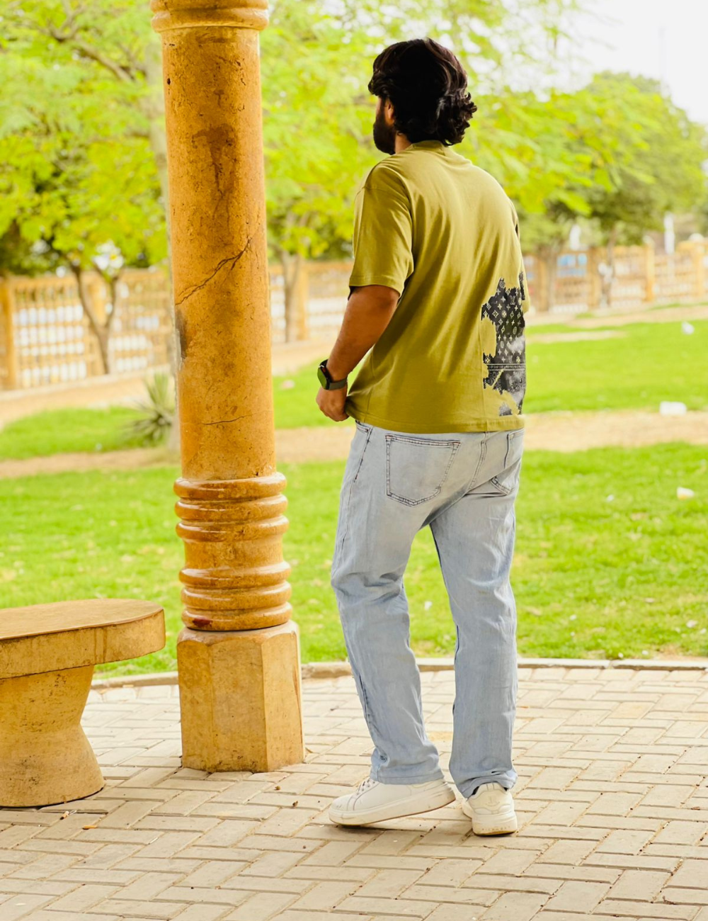 Level up your streetwear game with this olive green oversized T-shirt featuring bold abstract prints. Stylish, breathable, and urban-ready.